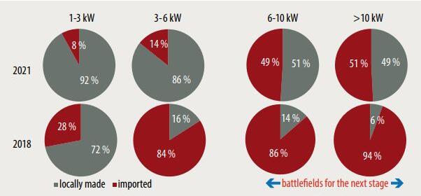 Figure 2 Localization trend of high-power fiber lasers in China in 2018 and 2021.source:Photonics Views - 2022 - Chinese laser market under the new globalization, DOI: 10.1002/phvs.202200022