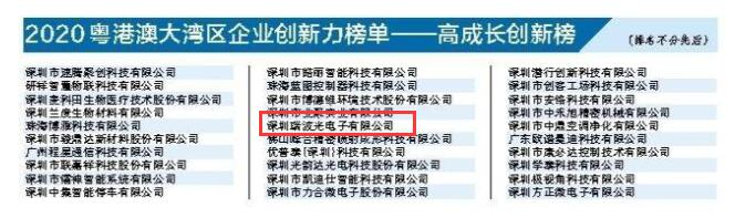 5月11日,2021年中國品牌日·深圳地方特色活動暨第五屆“深圳國際品牌周”重磅啟幕。大會首度發布“2020粵港澳大灣區企業創新力榜單”。由深圳工業總會聯合廣東省灣區新經濟研究院、深圳市力合科創股份有限公司、深圳創新發展研究院、深圳商報等機構共同開展,入選榜單的90家企業、50位人物名單正式發布,其中瑞波光電成功入選“高成長創新榜單”。