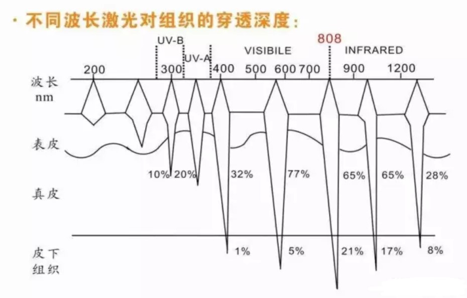 上圖中雖然沒有明確標識出755nm波長的激光皮膚穿透深度,但根據波長區間對應的穿透深度來看,以及結合下圖不同波長對皮膚的穿透深度不難看出,755nm波長能有效穿透至皮膚真皮層,對表皮到真皮各種色素病變都能達到不錯的治療效果。