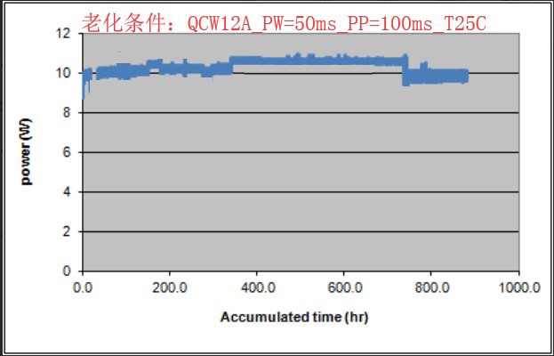 瑞波光電755nm 芯片老化數據(脈沖電流,脈沖寬度50ms,重復頻率10Hz)。完成850小時,即3000萬個脈沖,滿足祛斑和脫毛應用的壽命要求2000萬次