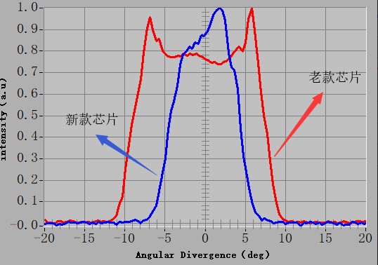 圖2:瑞波光電25W 905nm芯片新舊版本慢軸發散角的對比(測試條件:脈沖電流的脈寬為0.1ms,周期為10ms,相應的占空比為1/100,測試脈沖電流為1A。)