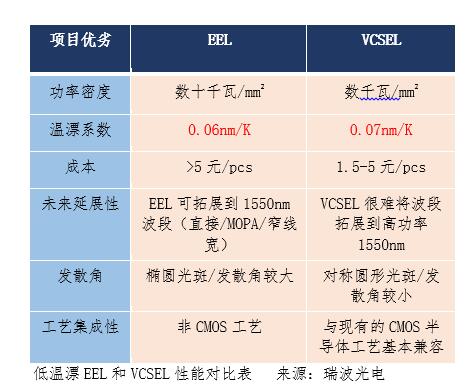 “EEL相比VCSEL的最大技術(shù)優(yōu)勢(shì)是光功率密度非常高,比VCSEL至少高1個(gè)數(shù)量級(jí)。目前瑞波光電開發(fā)的905nm EEL芯片的功率密度可以達(dá)到40KW/mm2,而當(dāng)前VCSEL通過多結(jié)工藝將功率密度最高提升到2KW/mm2,但仍與EEL有很大的差距。”