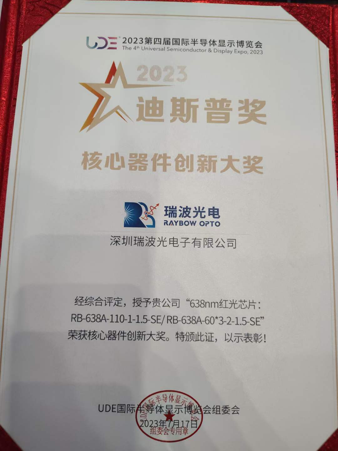 UDE2023第四屆國際半導體顯示博覽會榮耀打造以半導體顯示技術、產品和應用創新為評判標準的獎項—「UDE迪斯普獎」。通過每年度舉辦「UDE 迪斯普獎」評選活動,客觀公正地甄選出顯示行業企業的前沿技術和創新應用產品案例, 以此來為了表彰產品與技術創新、創新應用等各方面具有突出貢獻和重要影響力的企業和團隊,瑞波憑借激光顯示用大功率638nm 激光芯片成功斬獲迪斯普核心器件創新大獎,本次獲獎彰顯了瑞波光電的持續創新發展能力,并有望推動行業實現新的跨越與升級。