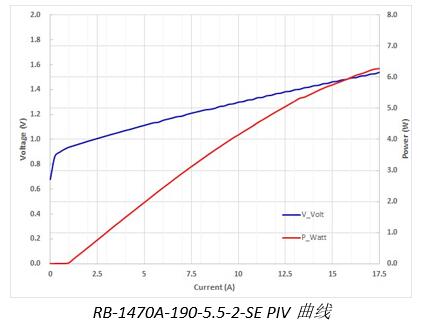 本次發布的1470nm芯片型號為RB-1470A-190-5.5-2-SE,發光條寬190μm,工作電流15A,工作功率5.5W,光電轉換效率26%。