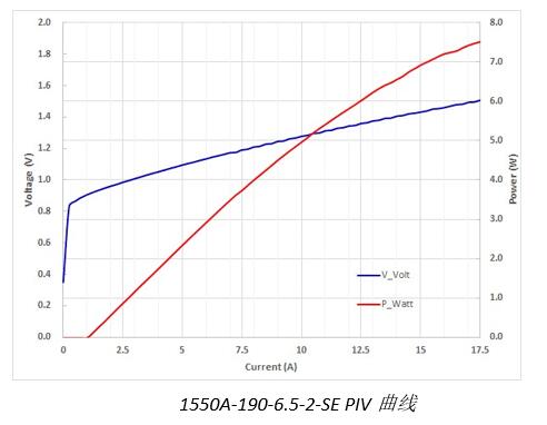 本次發布的1550nm芯片型號為RB-1550A-190-6.5-2-SE,發光條寬190μm,工作電流15A,工作功率6.5W,光電轉換效率29%。