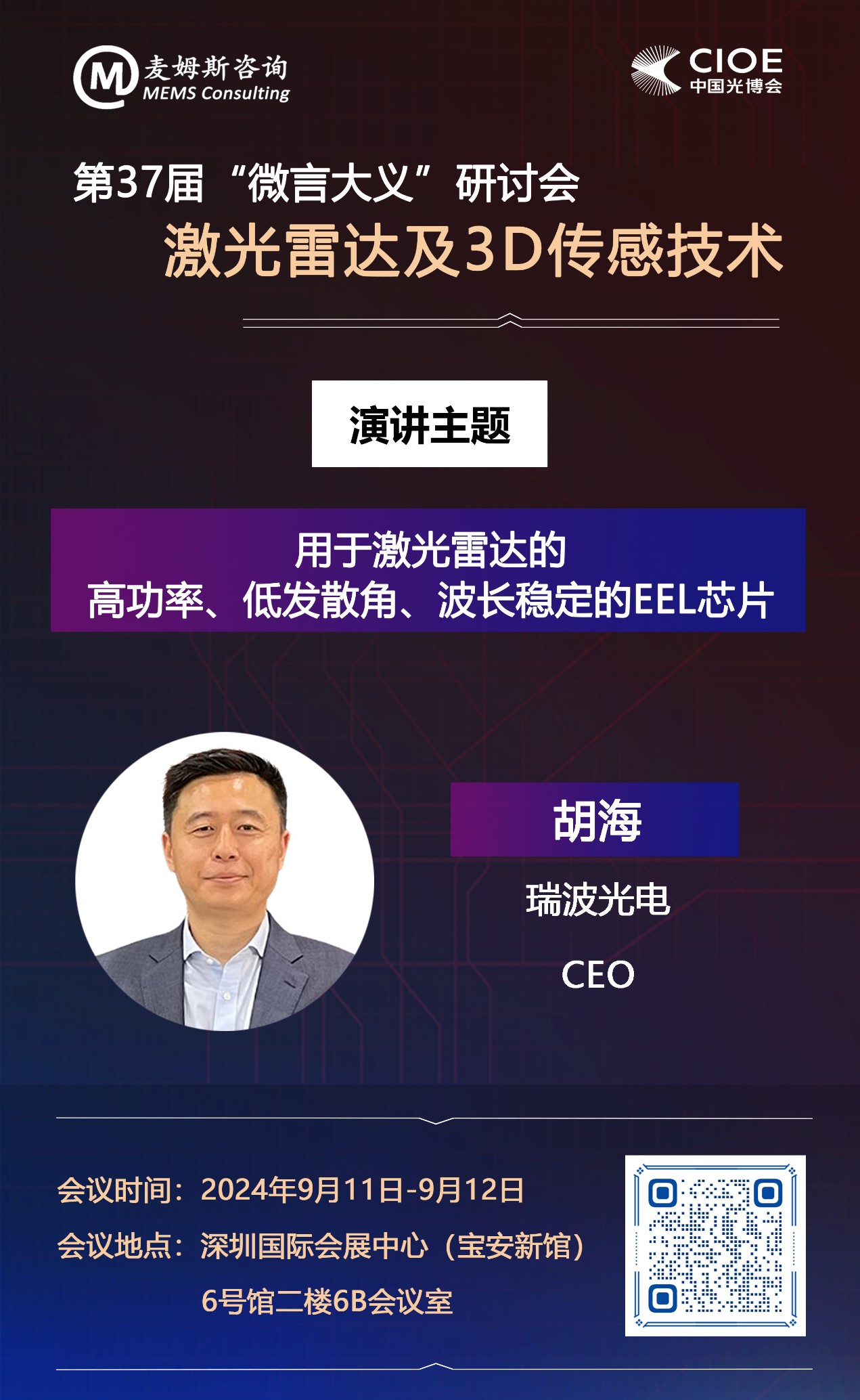 另外,瑞波光電總經理胡海博士也將在同期舉行的“第37 屆“微言大義”研討會:激光雷達及3D 傳感技術”上發表精彩演講,題目為:《用于激光雷達的高功率、低發散角、波長穩定的EEL芯片》,論壇時間為2024 年9月11 日13 :00~17 :00;9月12 日9:30~17:00 (共計1.5 天),歡迎蒞臨聆聽。