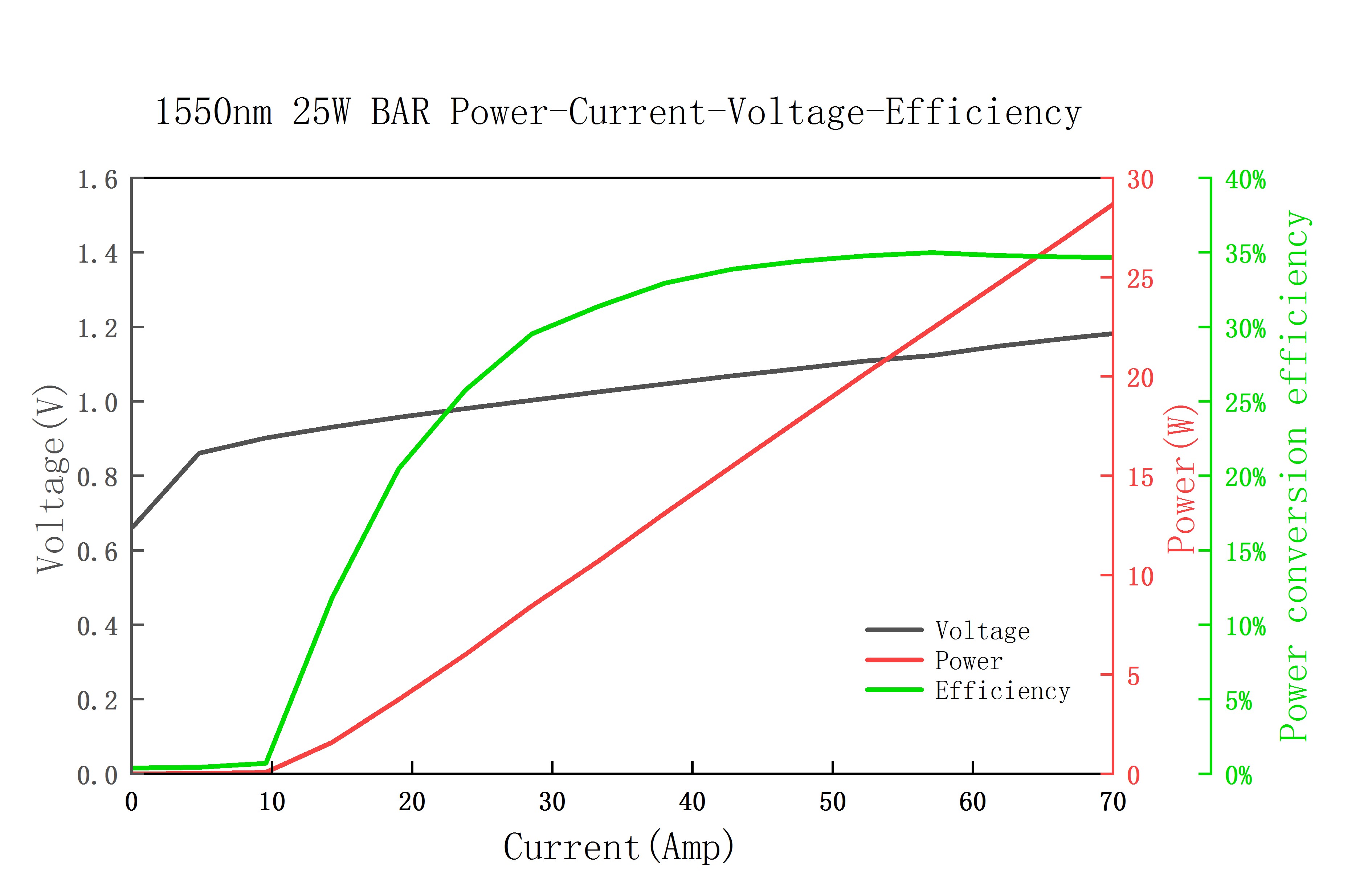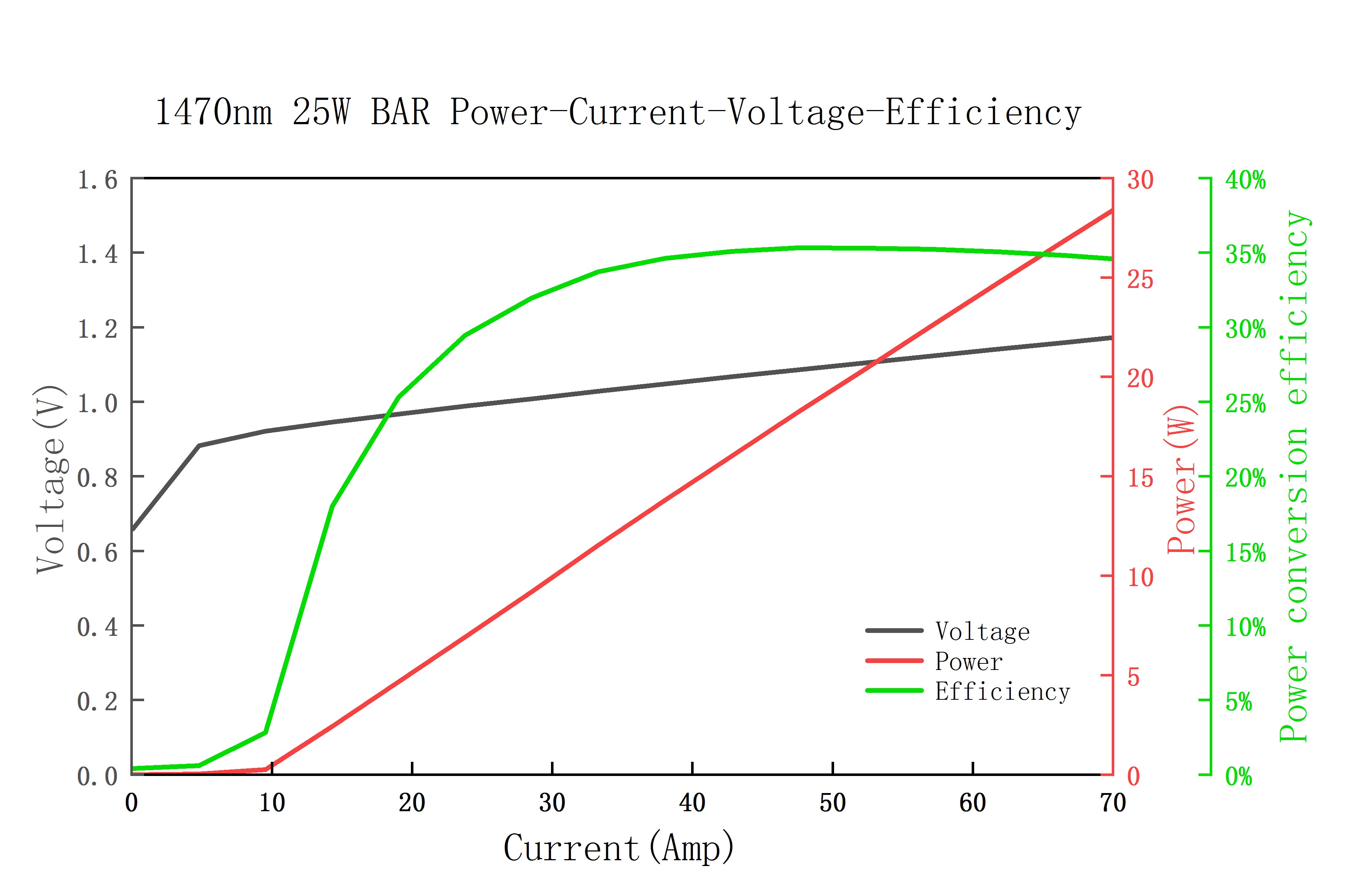 瑞波光電之前已經(jīng)推出了5.5W 1470nm和1550nm 單管芯片系列,本次推出25W 1470nm和1550nm巴條系列。巴條內(nèi)置19個(gè)發(fā)光點(diǎn),工作電流66A,光電轉(zhuǎn)換效率達(dá)33%,具有領(lǐng)先的性能和極高的性價(jià)比。