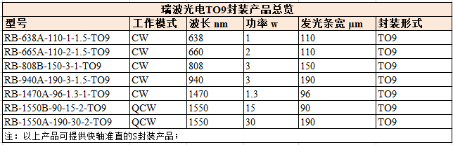 隨著大功率半導體激光器逐步在顯示照明、醫療、傳感等領域獲得越來越多的應用,產業界對封裝的要求也越來越多,瑞波光電在500mW-1W級(連續)和6W-140W(脈沖) TO56封裝器件的基礎上,近日開發出更大功率的TO9封裝器件,支持638nm/665nm/808nm/940nm/1470nm/1550nm等波長。